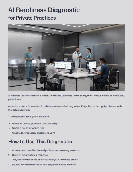 Identify your practice's AI readiness in under 5 minutes – Take the strategic diagnostic tool to discover whether you're ready to implement AI today, need to establish guardrails first, or should fix foundational workflows before investing in automation tools.